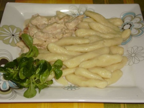 Krompirjevi svaljki, piščančji kosi z jurčki v smetanovi omaki; matovilec: