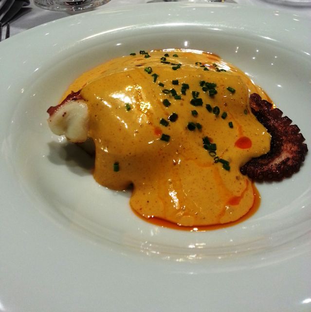 Nato Hobotnico z žara na krhlju krompirja, prekrito z peno iz paprike..