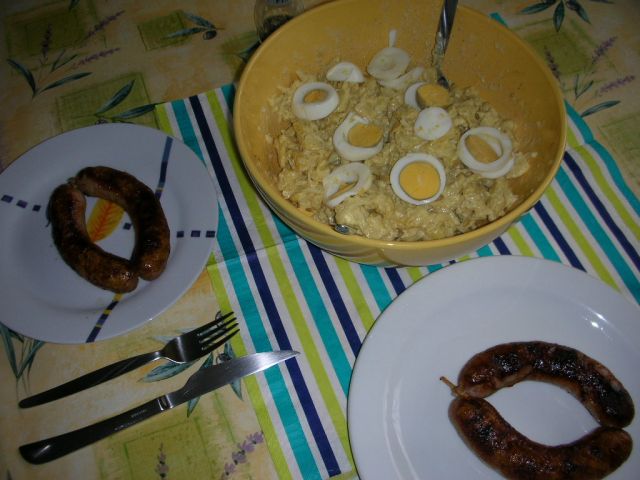 goveja juha z zdrobovimi žličniki, krompirjeva solata z majonezo in zenfom, pečenica......zdaj pa že tako lepo diši po ocvirkovki ![]()