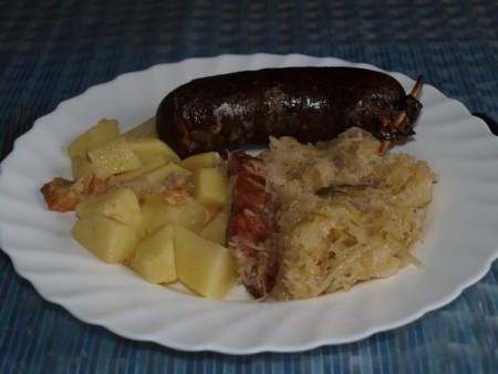 Dušeno kislo zelje, zabeljen krompir, krvavica: