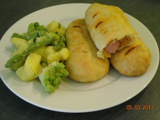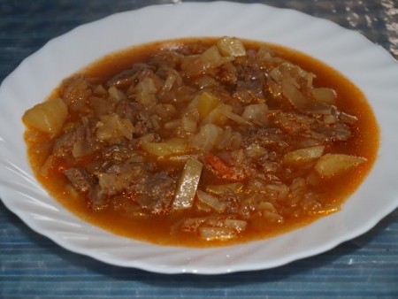 Recept je sledeč: na olju sem popražila pol čebule, dodala mleto sladko papriko in jo malo prepražila, dodala meso. Vse skupaj spet malo popražila, dodala sol, poper, origano, baziliko in en strok česna. Nato sem malo zalila z vodo in kuhala 2 uri (!). Meso je bilo nemreč za zrezke in se ni hotelo zmehčati. Drugače pa govedino vedno kuham okrog ene ure, ker ima šele potem res okus (drugo so zrezki, ki jih pečem 4 minute). Po dveh urah sem dolila kar precejšnjo količino vode (pribl. 1l) in dodala svež narezan korenček. Ko je voda zavrela, sem vanjo vsula makarone, zamrznjen grah in dodala žlico paradižnikove mezge. To je to. Makarone vedno kuham na tak način, ker se fajn prepojijo z omako, če jih samo poliješ z njo, ni tako dobro. Za zelje je pa tako: odrežem en kos zeljnate glave in ga enostavno zrežem. Čeprav zame to ni toliko na tenko, kot bi si želela, ampak če ga ribam z ribežnom je pa pri meni prebeč odpada (ne vem, a ne znam??). Danes pa pri nas ričet s Krpanovo klobaso