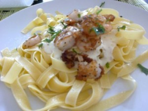 Včeraj domače testenine s smetano in zapečenimi kozicami s cimetom, zelena solata z radičem. ![]()