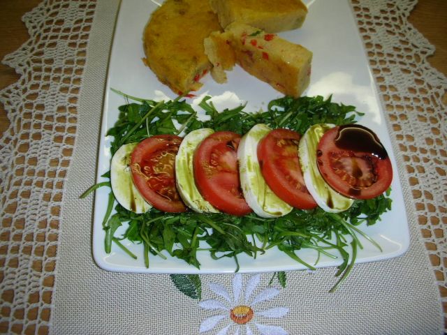 Danes: paradižnikova juha z rižem, pečena polenta s sirom in zelenjavo, rukola,paradižnik,mocarela