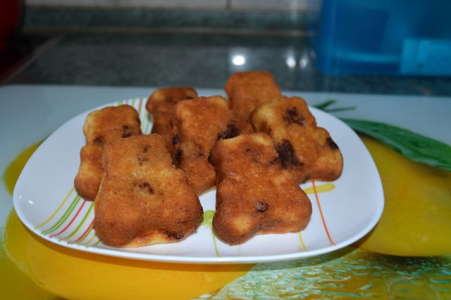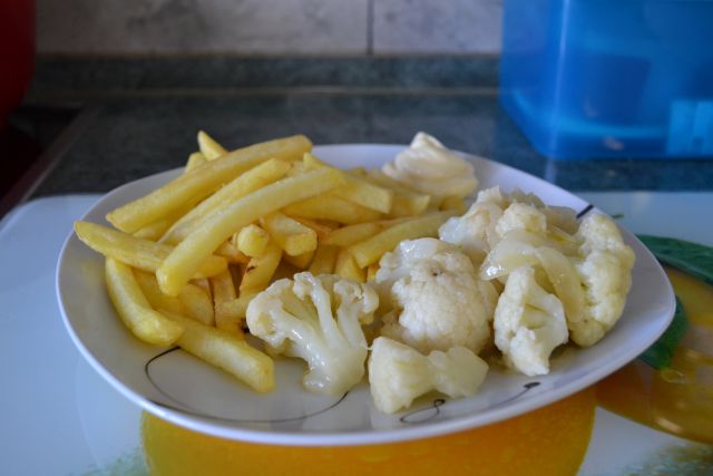 pomfri in na maslu ter čebuli dušena cvetača, za sladico pa chocolate chip muffin medvedki.