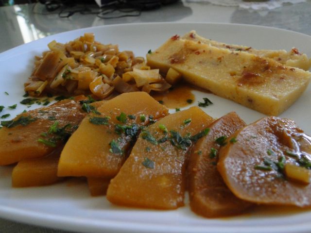 Jaz bom danes pripravljala nekaj iz rumene buče, verjetno pečeno. Sem jo včeraj dobila v dar, pa moram izkoristiti. Rezine bom najprej malo marinirala, potem pa popekla, pa malo pora poleg podušila. Morda bom zraven naredila polento s sušenimi paradižniki, si jo že dolgo želim. Pa bom dva dni preskrbljena, ker polente pa ne morem skuhati samo za en krožnik. Drugi jedci pa niso ravno navdušeni nad njo.