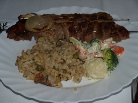 Goveje/piščančja juhica (od včeraj); reciklaža rižote, zelenjava v smetanovi omaki, sv.ribica nataknjena na palčke; motovilec: