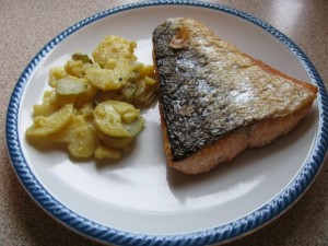 Usukan močnik, file lososa in krompirjeva solata s kislimi kumaricami: