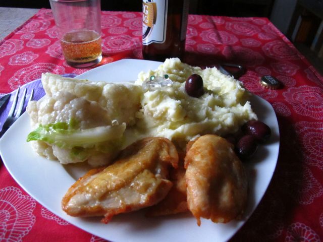 Danes namesto postrvi in blitve pohan oslič po ljubljansko in skleda regrata s toplim krompirjem. Je bilo vseeno zelo dobro.