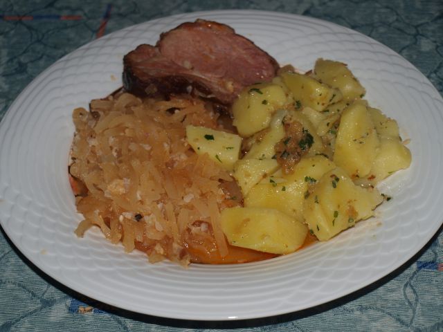 Kisla repa z ajdovo kašo, krompir v kosih zabeljen z ocvirki, rezina šunke: