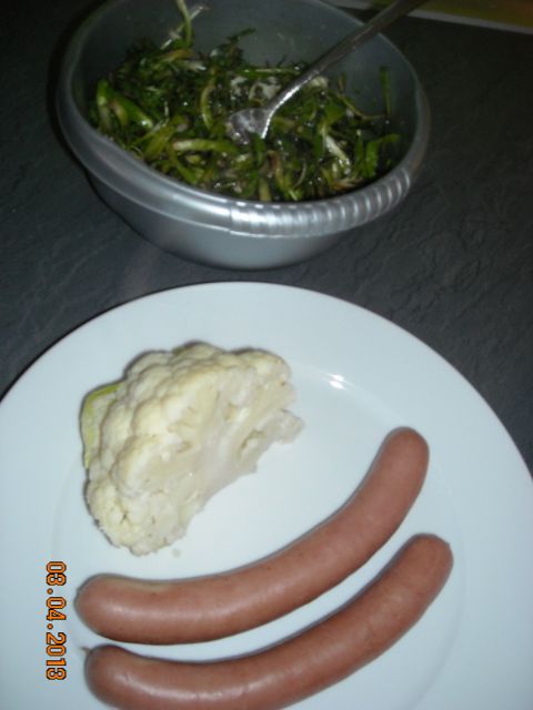Danes pa regrat z zadnjim pirhom, cvetača, hrenovke (zame samo 1/4), za mojega še kruh.
