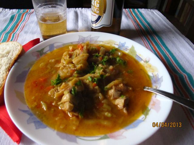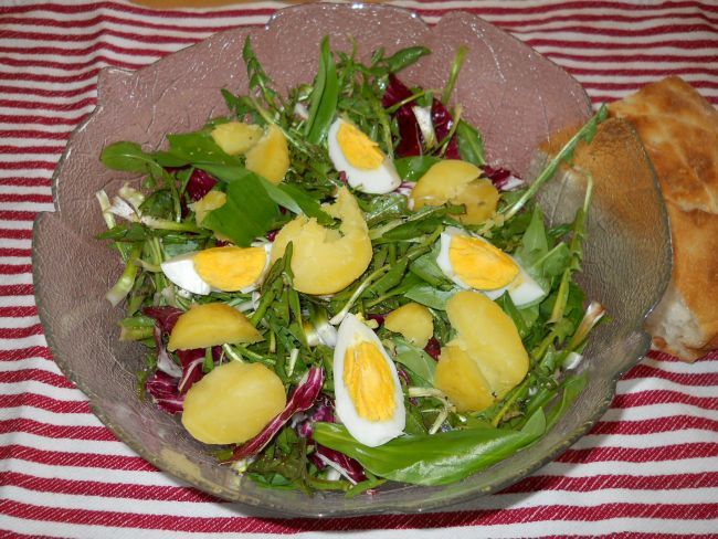Čiščenje organizma--regrad,radič,čemaž, dva kromirčka in jajček.Zabeljeno z popečeno panceto in veliko česna na olivnem olju in kisu..pogača![]()