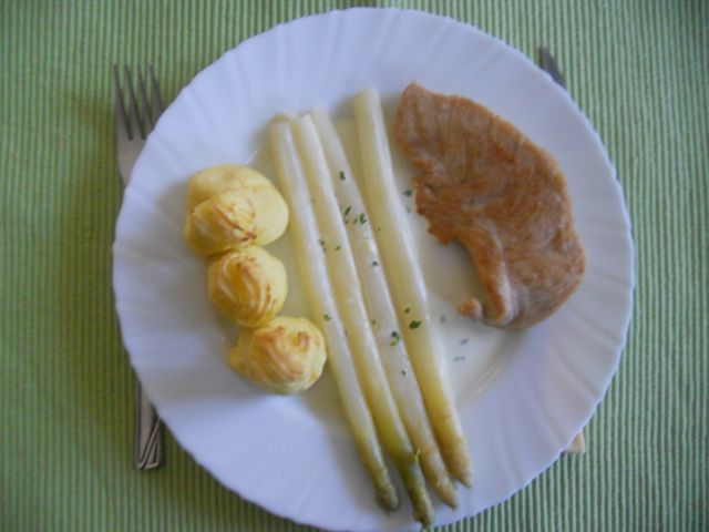 mali kuharZeleni šparglji in krompir na maslu, za povrh skutna krema s sadjem.