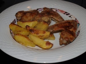 Tokrat mi je skuhala tašča: juha, pečen krompir, pečene perutničke, solata.