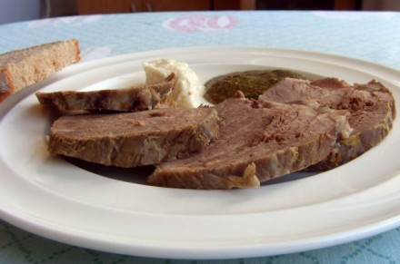 ), meso iz juhe, hren, pesto iz bučnih semen, rdeča pesa
