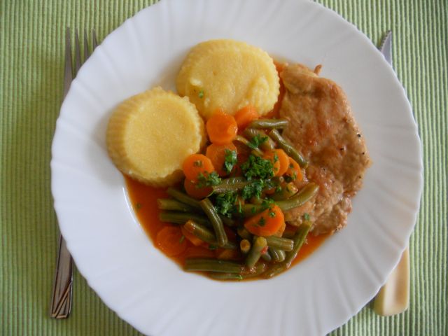 mali kuharDanes: polenta, stročji fižol s korenčkom v omaki, svinjski zrezki, rdeča pesa, atomski štrudelj