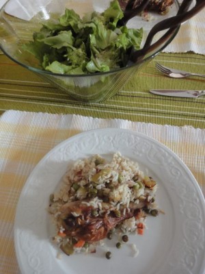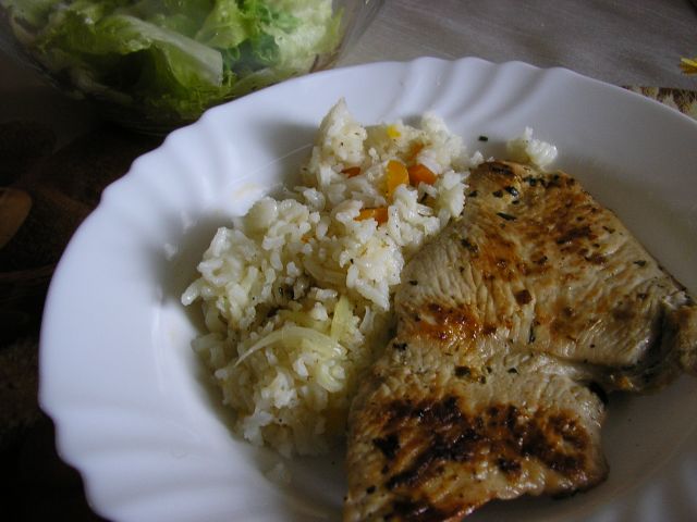juhica, puranji zrezek z žara, riž (tokrat ni iz pečice, ampak iz ponve