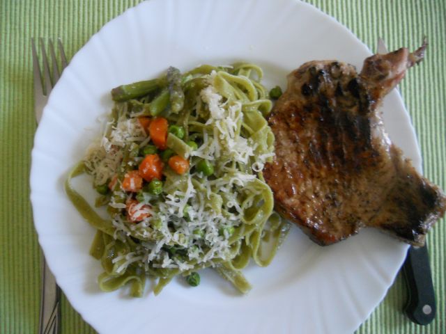 ursiiiDanes: testenine s šparglji in zelenjavo, zarebrnice na žaru, solata, zraven še kruh polnozrnate moke in seme