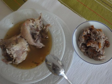 ČETRTEK: nekakšna obara z domačo kuro in ajdovimi žganci zabeljenimi z ocvirki, jagodni sladoled, ki sem ga danes naredila.