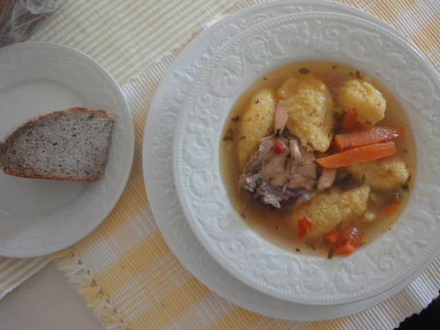 PETEK: delna ponovitev od včeraj, juhica z zdrobovimi žličniki, ajdov kruh in kajmak, kateremu se nisem mogla upreti.
