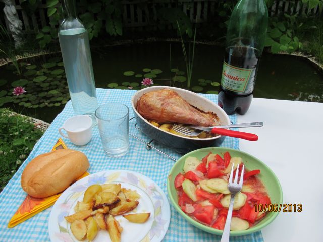 Danes domače pleskavice, piščančji file in perutke, pomfri, šobska solata, redkvice, mlada čebula, ajvar ..... Ker me bolijo noge, nekaj na hitro.....