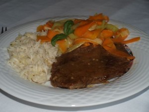 Goveji zrezek v omaki; basmati riž na poru; dušen korenček, paprika in zelena; solata - berivka/rukola: