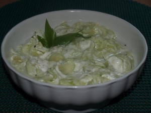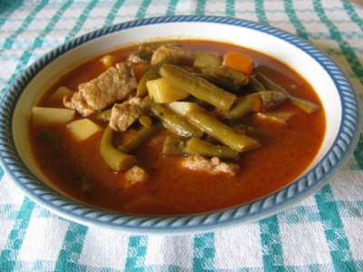 Goveji golaž, žličniki s čemažem; kumarična solata z jogurtom:
