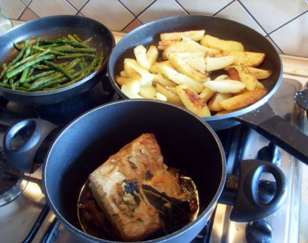 Ker smo po sili razmer doma, včeraj goveja juha s fritati, telečji trakci v omaki, zelenjavni riž v katerega je padla lisička po kratkem sprehodu, skleda domače zelene solate. Pa spekla sem ribezovo pito z jagodami.