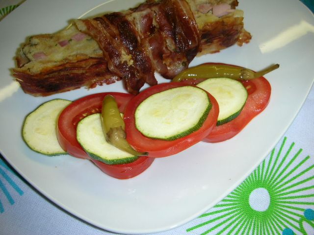 Za papico pa je bila ZELENJAVNA PITA + puranje meso v naravni omaki (olivc + maslo) ter dve skledi soljat. Ena je bila osvežilna kumaričina z jogurtom in korenčkom, druga pa domača rdečka s feta sirom.