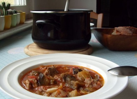 Juha, pečena rebra, pečen krompir, dušeno zelje, kumarična solata.