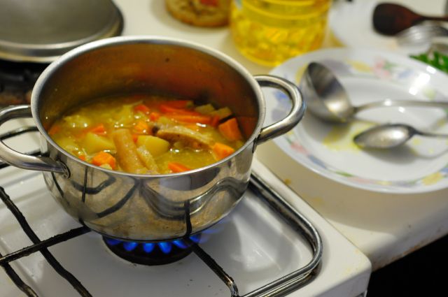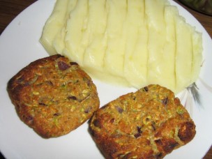 Zelenjavna juha (korenje, petršilj, grah, koleraba, čebula, krompir, zelena), pečen kropir, kremna špinača in pečeni mesni uštipci.![]()