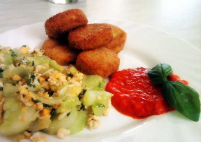 Pohane bučke, prologa pa so podušene kumare s čebulo, vmešan jajček. Posebej ajvar.