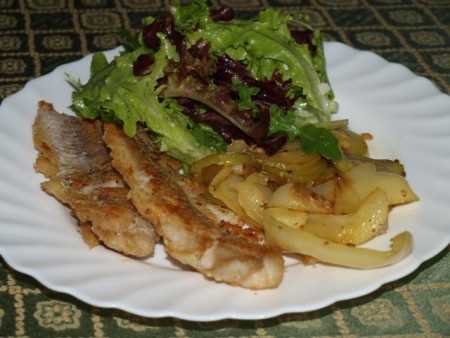Pečen ribji file, bučke in paprika s česnom;