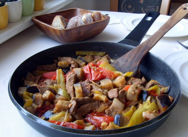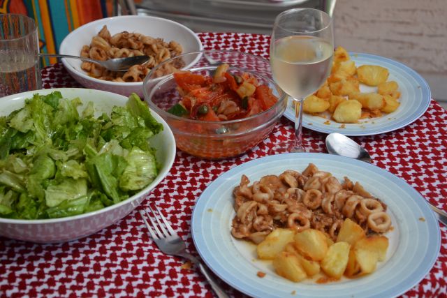 Lignji na ingverhu, česnu, z dodatkom sojinem ribje in ostrigine omake, pa kanček vina; zraven pečen krompir z vrta, zelena solata z vrta moje mame,in na hitro opelena zelenjava z lastnega vrta; kam sodi prt na mizi, pa ugibajte: