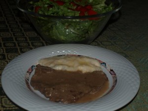 krompir v kosih, špageti in piščančji zrezki v naravni omaki, paradižnikova solata