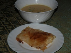 Bučna juhica; goveji zrezek, kuhani štruklji, mešana solata; bučnica
