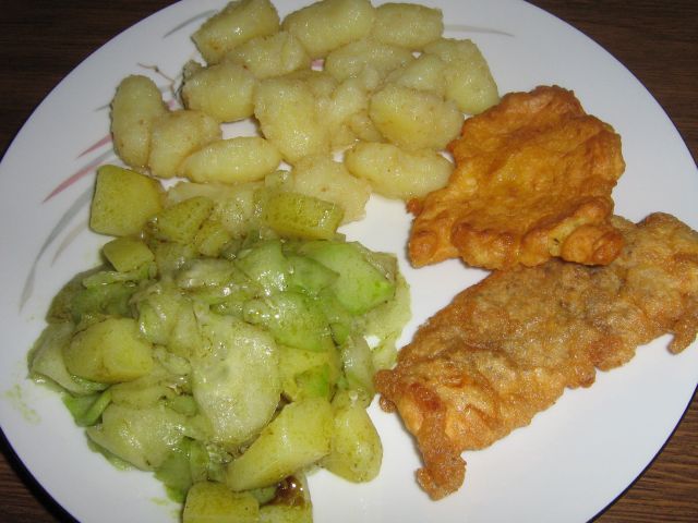 ocvrti piščančji fileji, krompirjevi njoki in kumarična solata s krompirjem: