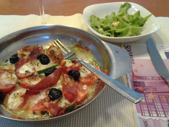 Moje današnje kosilo: bučke, moj balkonski paradižnik,pršut mocarela, olive, začimbe, moja domača berivka in po novem se brišemo s 500-aki (papirnatimi servietki, da ne bo panike...)