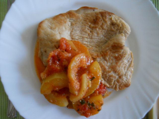 Pipi MajDanes: puranji zrezki, bučke v omaki, mešana solata