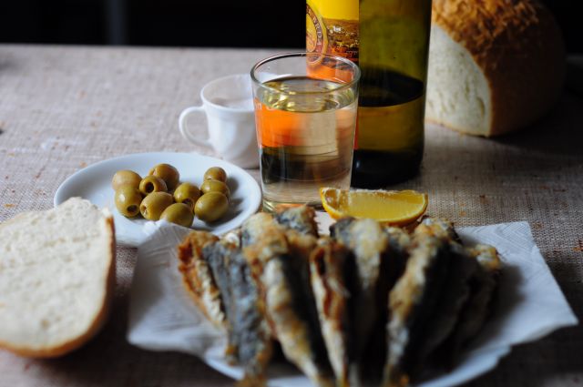 ocvrte sardelce (iz kioska na eni tržnici, sem zmogla le pol porcije), endivija z zrnatim fižolom v solati, kruh. Pojedeno doma, seveda.