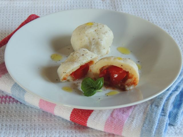 Za 12 cmokov: 250 g ricotte, 125g gladke moke, malo soli, 50g parmezana..Razdelimo na 12 35g krogljic. Za nadev pa 12 češnjevcev, ki jih zarežemo do polovice in vanje po ščep soli in popra. Kuhamo v slanem kropu 15 min.