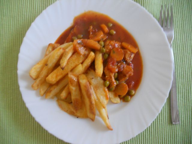 Pri nas danea goveja juha s fritati, ker nisem imela časa za domače rezance, dušen riž, svinjska ribica s sirom, mešana solata