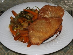 Bučna juhica; korenček, zelena in por iz voka, panirani puranji zrezek; zelena solata