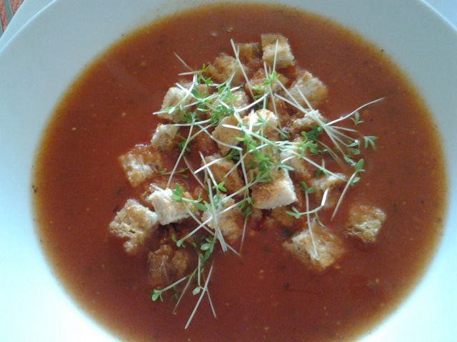 Moja dva pa poleg juhe, ribje palčke in krompir -sin (hvala za idejo Babka), mož pa hrenovko, vsi pa še domači balkonski paradižnik - volovsko srce v solati