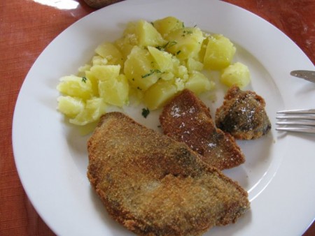 Pri nas pa danes v kosih krompir s česnom, pohane marele in solata.