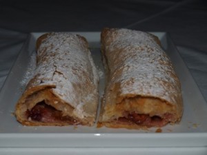 Goveje-kurja juhica z zdrobovimi cmoki; sladko zelje s krompirjem v kosih, pečene perutničke, zelena solata s korenčkom; jabolčno-slivov zavitek: