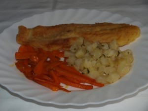 Korenčkova juhica z narezano palačinko; ribji file, pražen krompir, dušen korenček; zelena solata z rukolo; kremšnite od "najboljšega soseda":