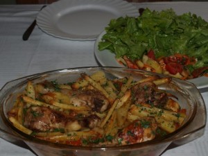 Juha, pečene perutničke, polenta, pražene marele, solata.