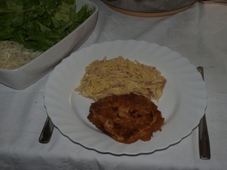 Špageti "karbonara", sv. zarebrica panirana s parmezanom; mešana solata: