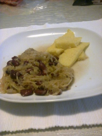 Ker sem bila sama doma, sem k včerajšnjemu zelju dodala še fižol, zraven sem si skuhala in popekla polento.