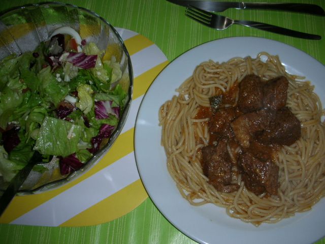 Danes pri naju: špageti, golaž, mešana solata in nekaj sladkega